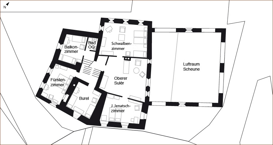 Sanfte, sorgfältige Renovierungen haben die Chesa Wazzau zu einem seltenen Liebhaberobjekt gemacht: Küche, Korridor und Bäder sind mit Granitböden ausgestattet, das Bad und die Küche werden über eine Fussbodenheizung geheizt. Im Erdgeschoss des Hauses befinden sich zwei Stüvas (Wohnstuben), eine geräumige Gewölbeküche, ein grosses Bad mit Gewölbedecke, ein Einbettzimmer und ein grosser Vorraum (Suler), der zum gemütlichen Verweilen in grosser Runde einlädt. In den beiden oberen Etagen sind fünf Schlafzimmer und ein kleines Bad untergebracht.