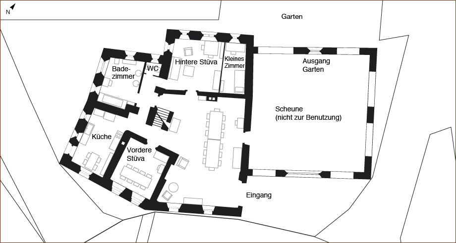 Die Chesa Wazzau, ein massiger Steinbau mit breiten Satteldach, ist ein typisches Engadiner Bauernhaus. Charakteristisch sind die kleinen Fenster, die aussehen wie Schiessscharten: Je kleiner die Fenster, desto weniger Wärme gibt das Haus nach aussen ab. Damit trotzdem möglichst viel Licht in die Wohnräume gelangt, sind die Fensternischen nach aussen wie Trichter gebaut. Die Stubenfenster sind auf die Strasse oder den Vorplatz ausgerichtet – schliesslich will man ja wissen, was im Dorf so passiert.